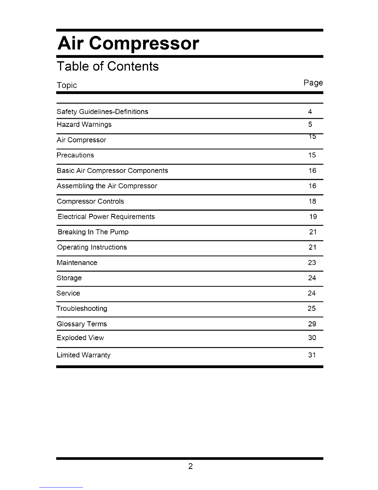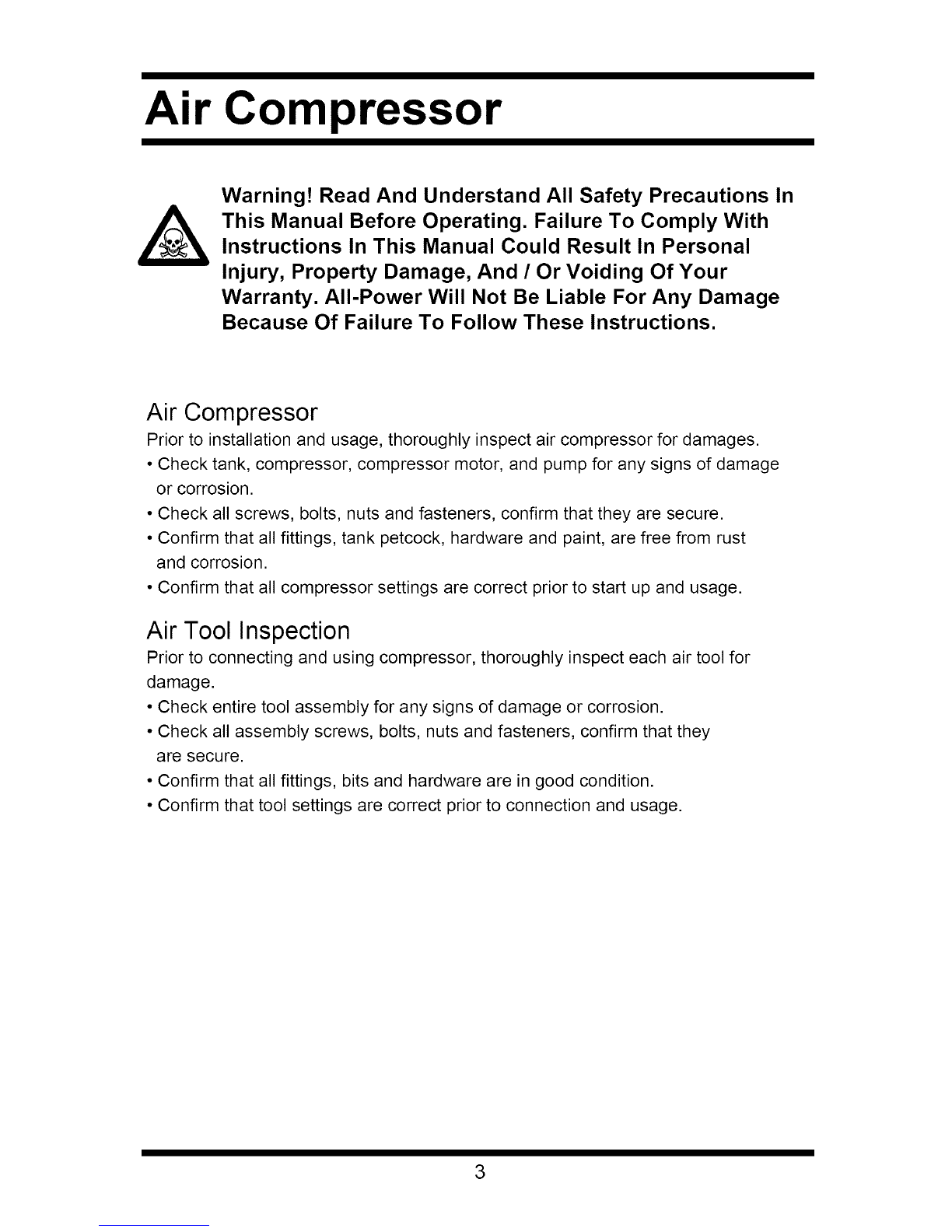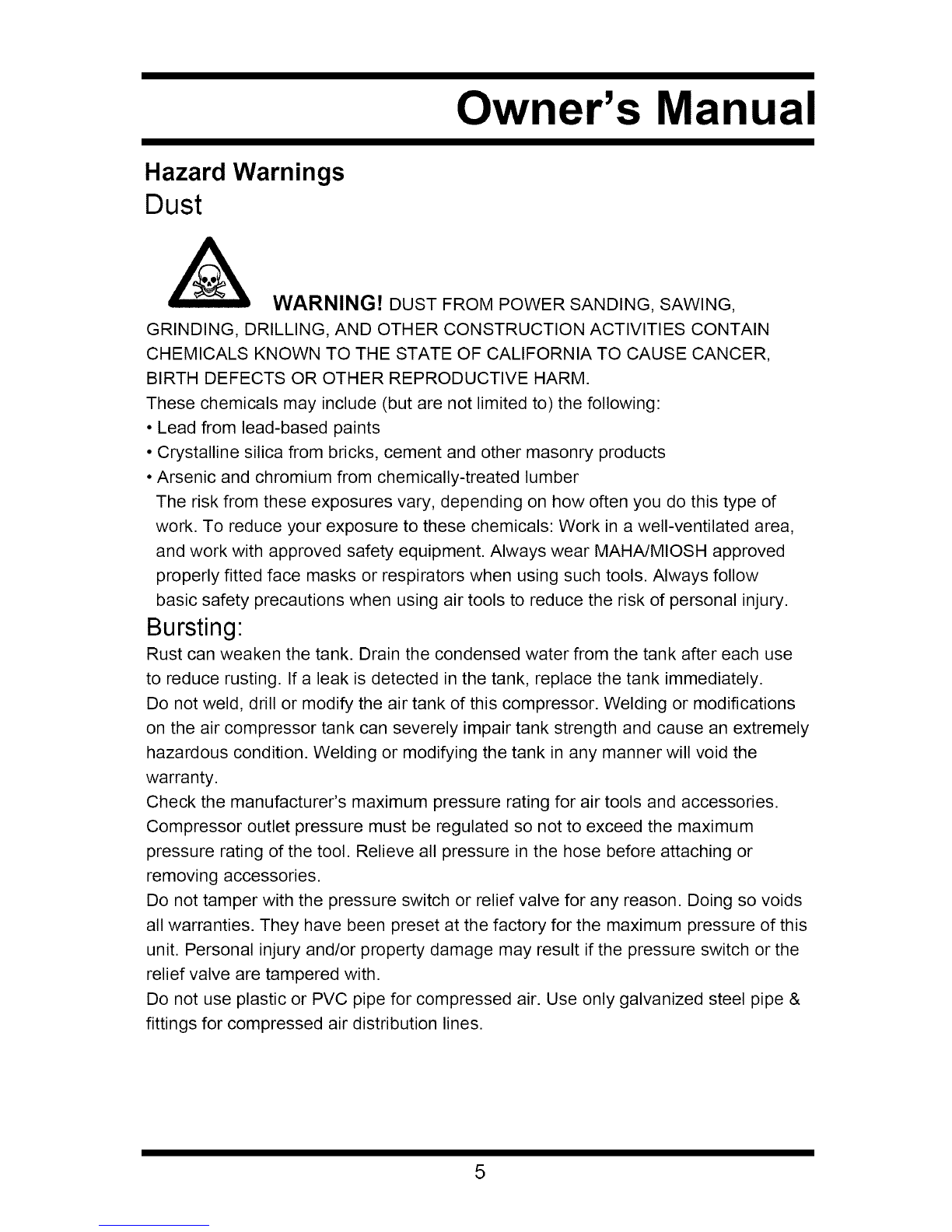 Do not weld, drill or modify the air tank of this compressor. Welding or modifications