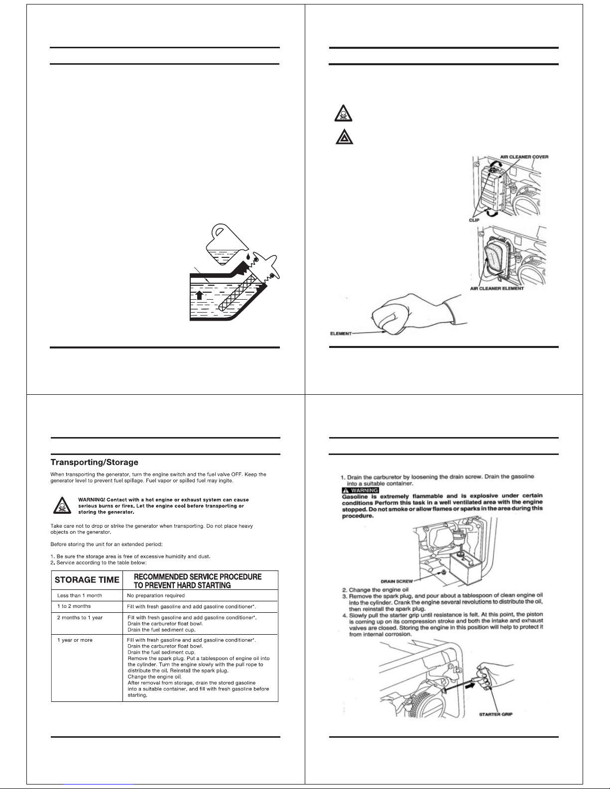 Do not refill the fuel tank while the engine is running or while the engine is still hot. Do not