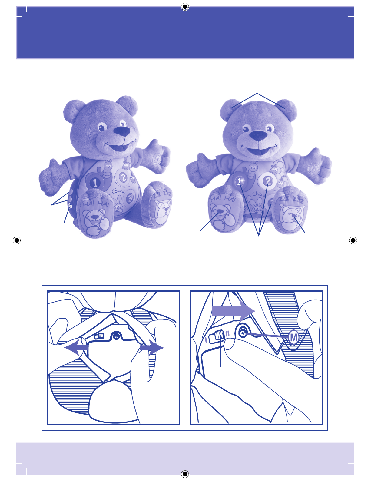 • Au moment de l’allumage, le jouet est automatiquement réglé sur la langue maternelle. Il suft d’appuyer sur les boutons situés sur le coté de l’ourson (B ) pour changer la