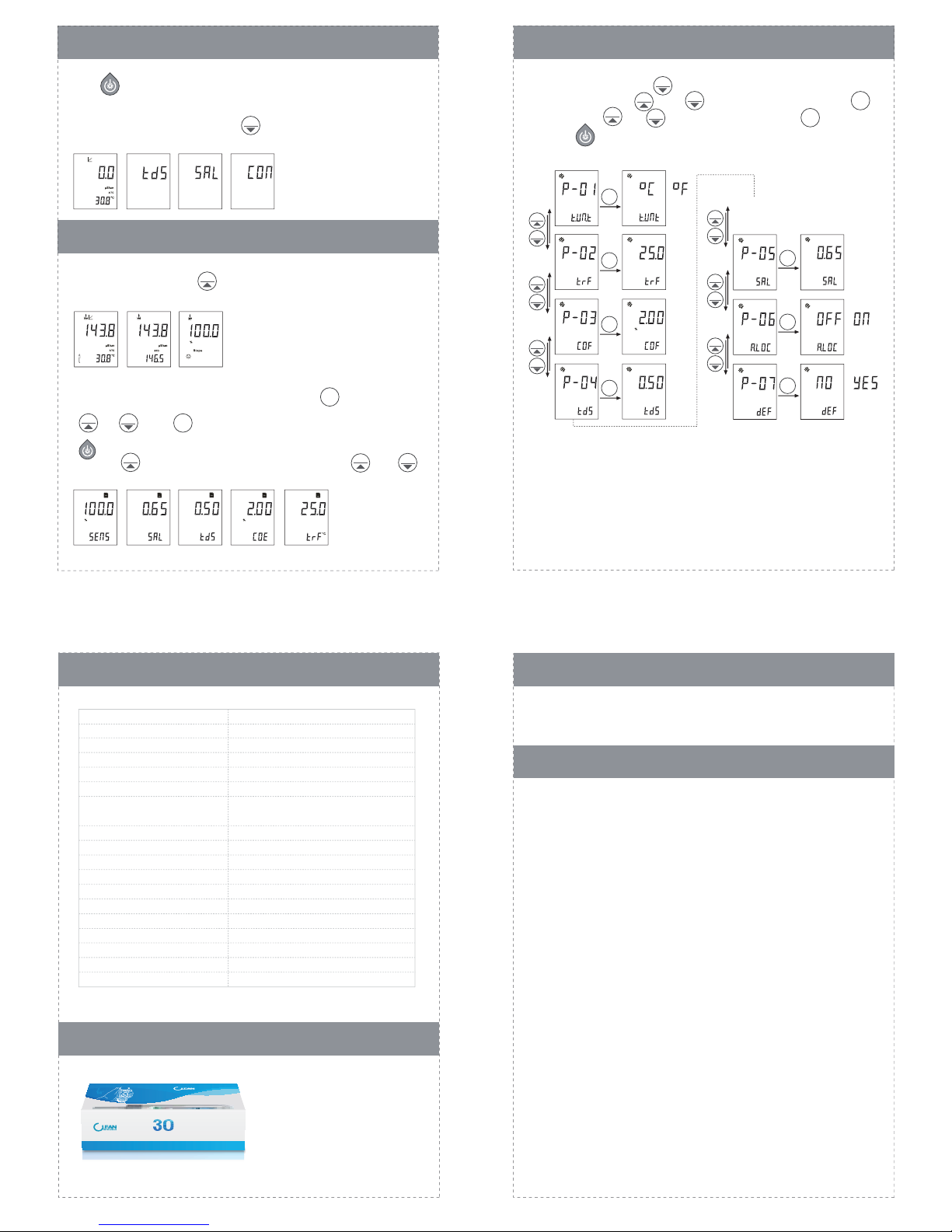 Note: In measurement mode, long press " " to switch between Conductivity / TDS /