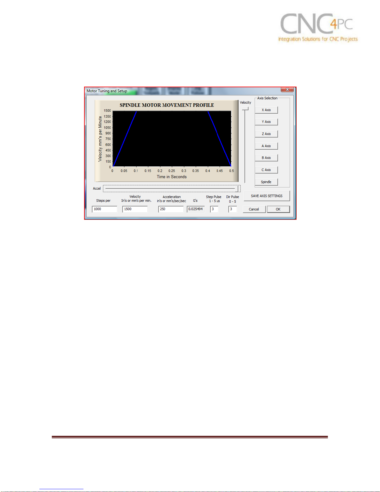 dialog window Config / Motor Tuning / Spindle. Set velocity and acceleration to the