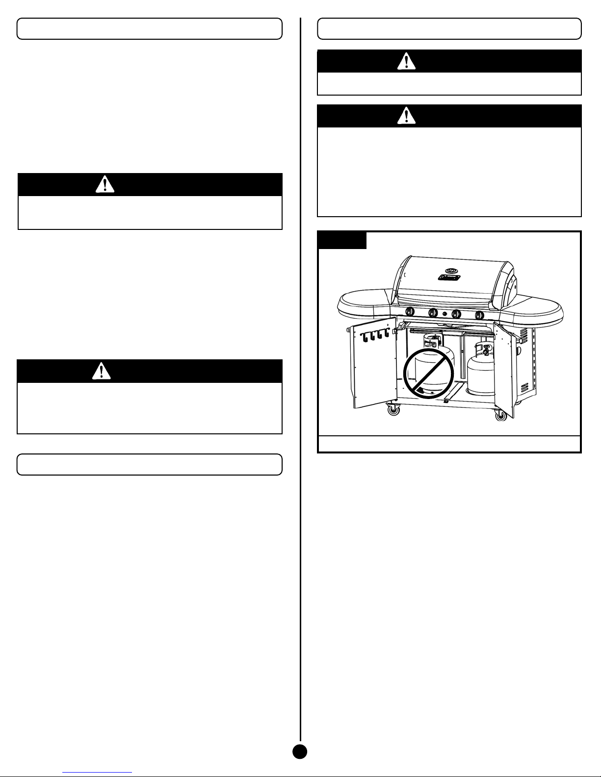 • DO NOT use gas grill indoors or store any propane cylinder(s)