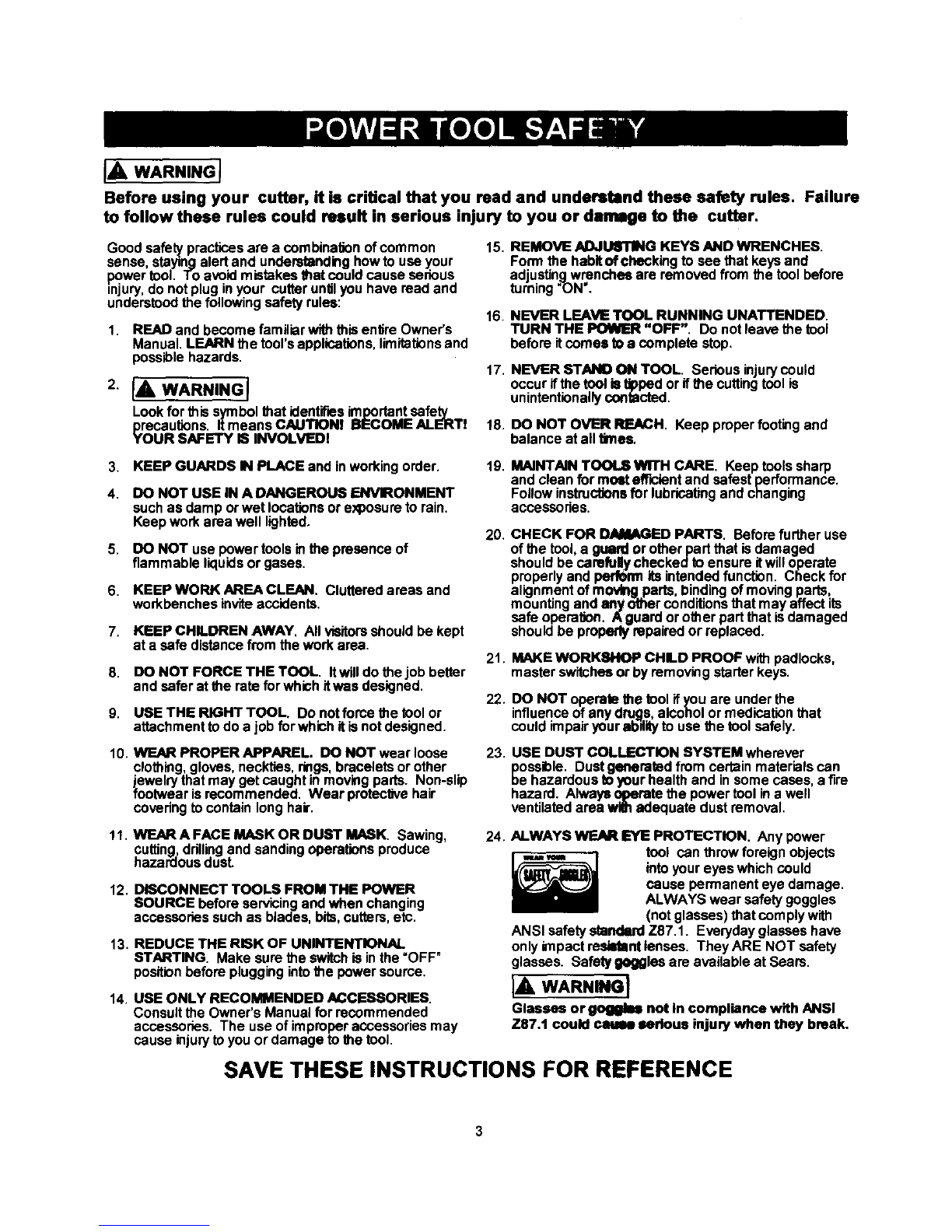 24. ALWAYS WEAR EYE PROTECTION. Any power