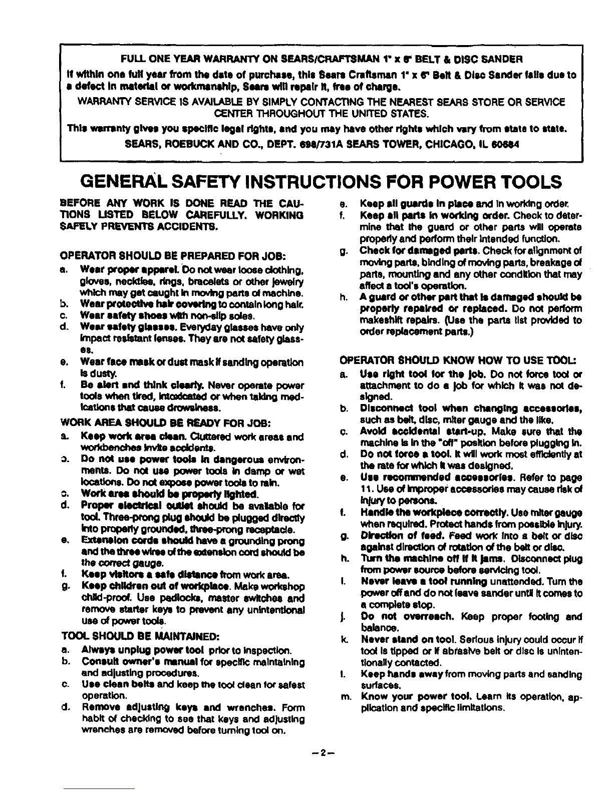 FULL ONE YEAR WARRANTY ON SEARS/CRAFTSMAN 1" x 6" BELT & 015C SANDER