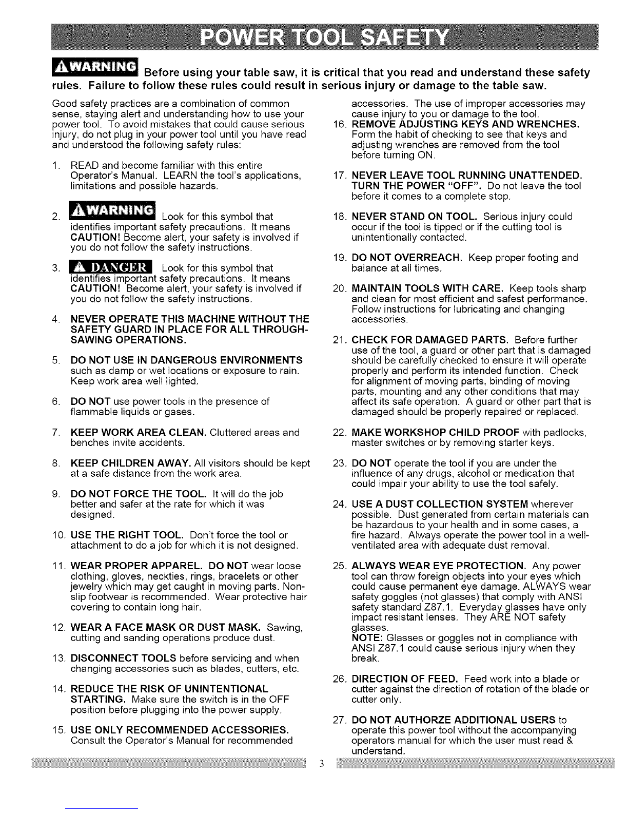 Before using your table saw, it is critical that you read and understand these safety