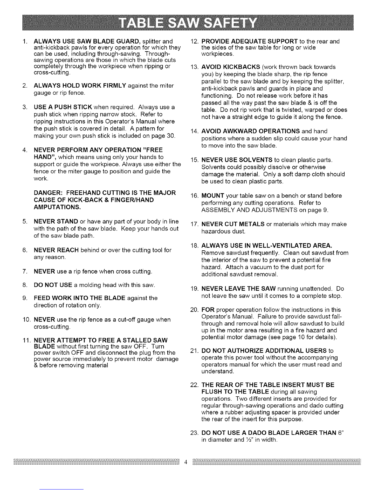 rules. Failure to follow these rules could result in serious injury or damage to the table saw.
