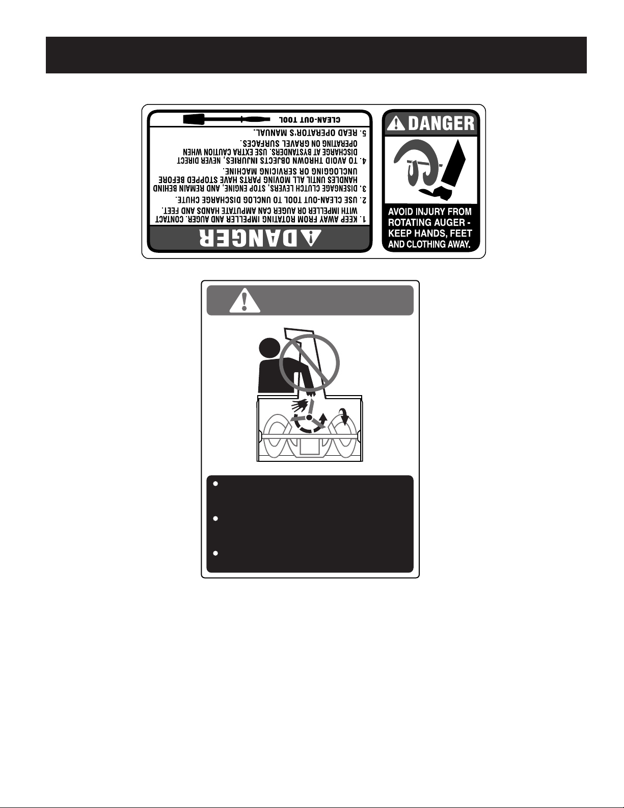 not unclog chute assembly while engine is running. Shut off