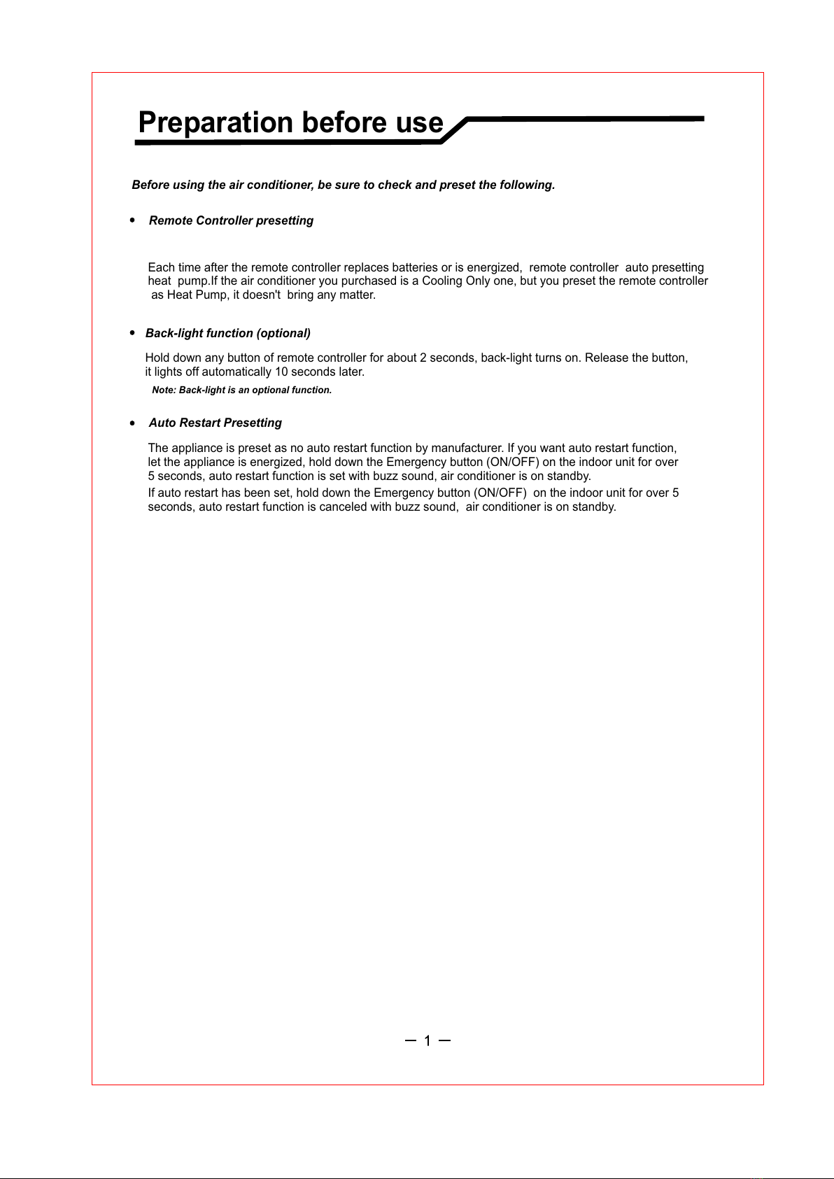 Before using the air conditioner, be sure to check and preset the following.