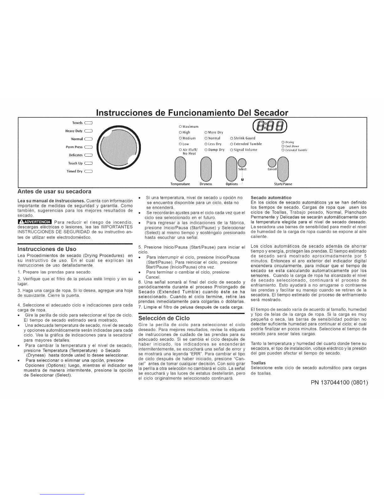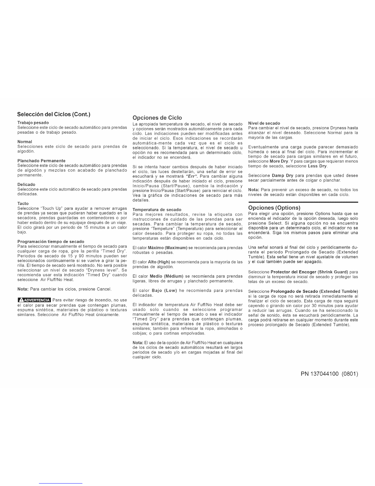 Nota: El uso de la opci6n de Air Fluff/No Heat en cualquiera