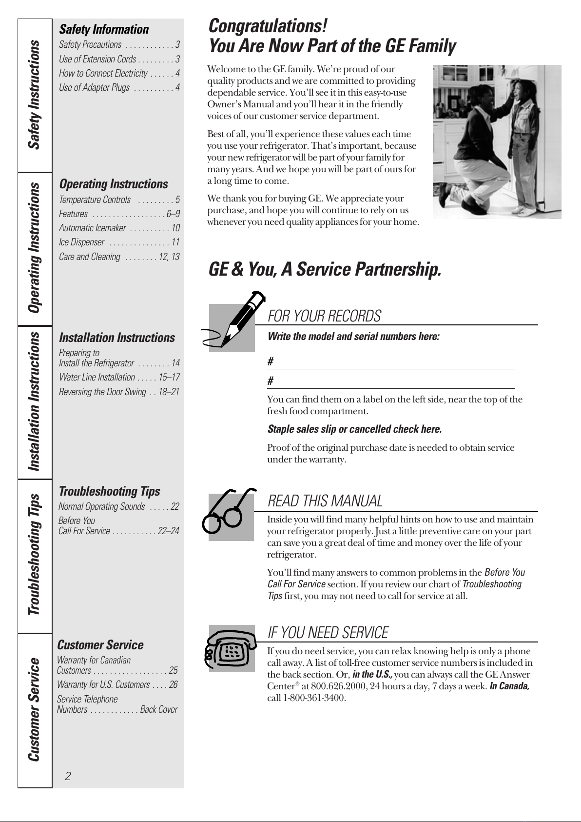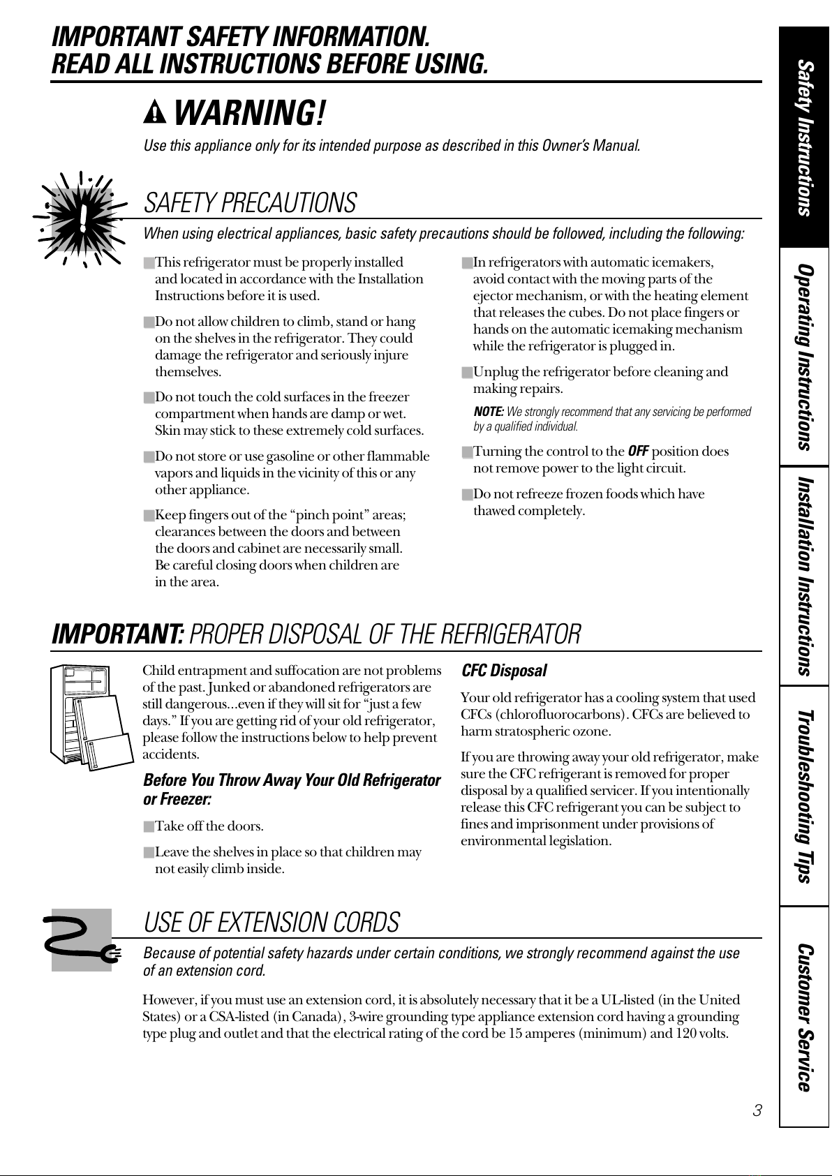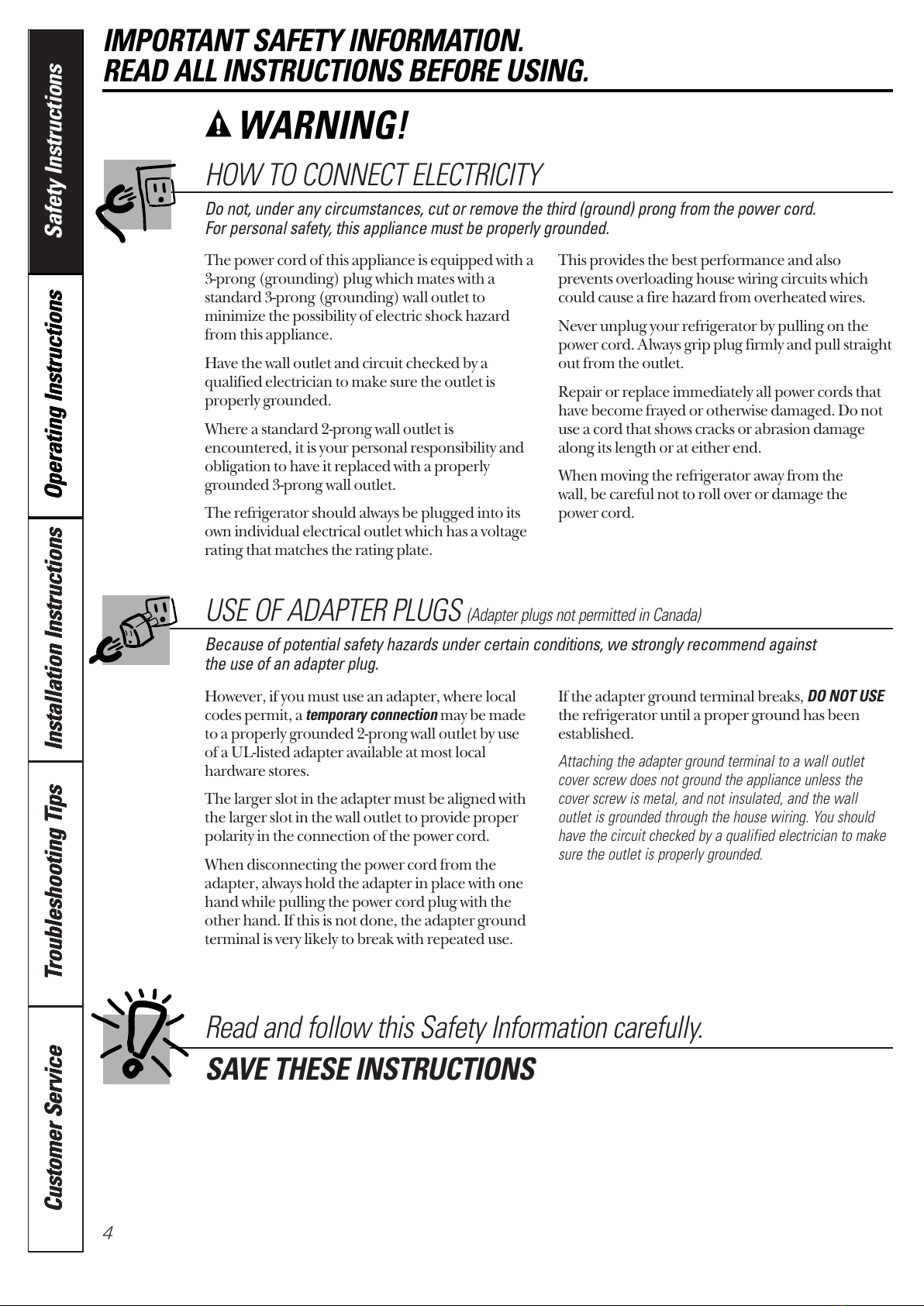 Customer Service Troubleshooting Tips Installation Instructions Safety Instructions