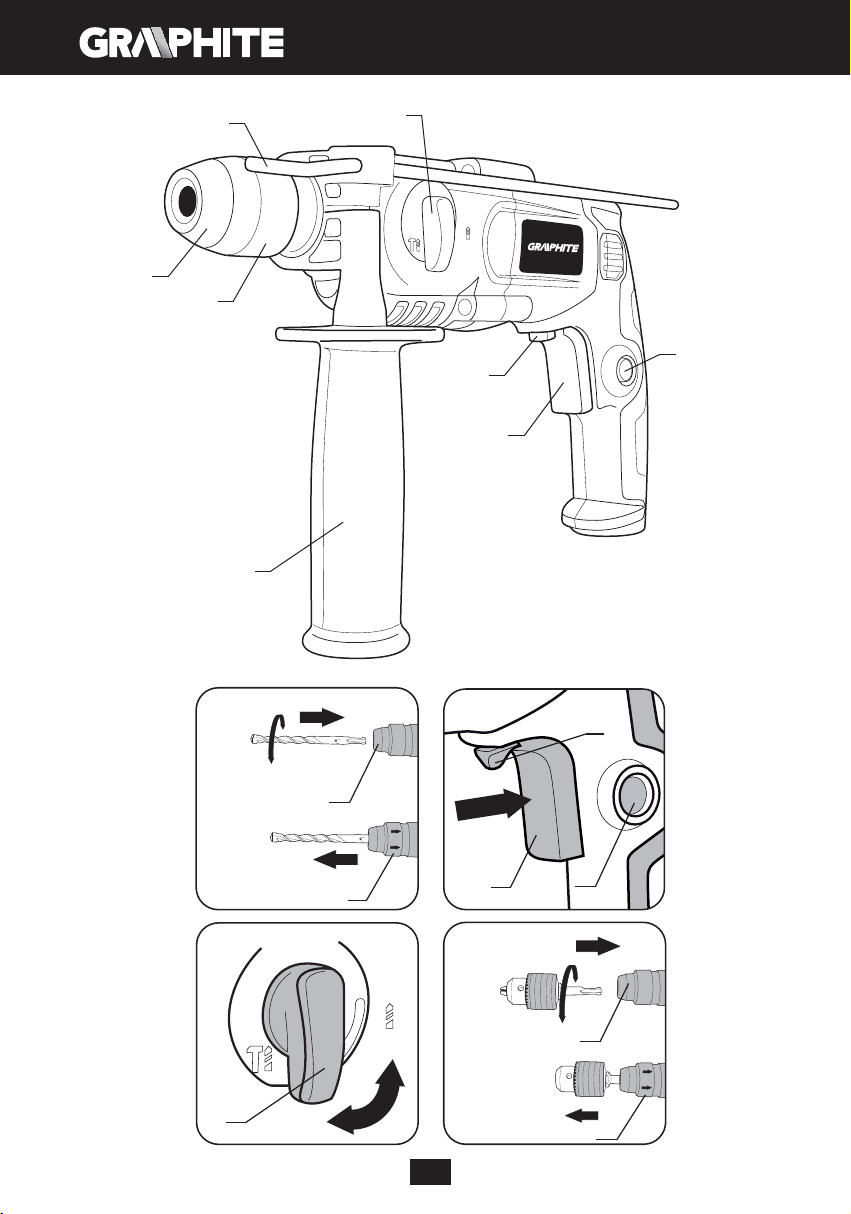 Młotowiertarka posiada system mocowania clic-clic (bez konieczności odciągania tulei mocującej (2) pod-
