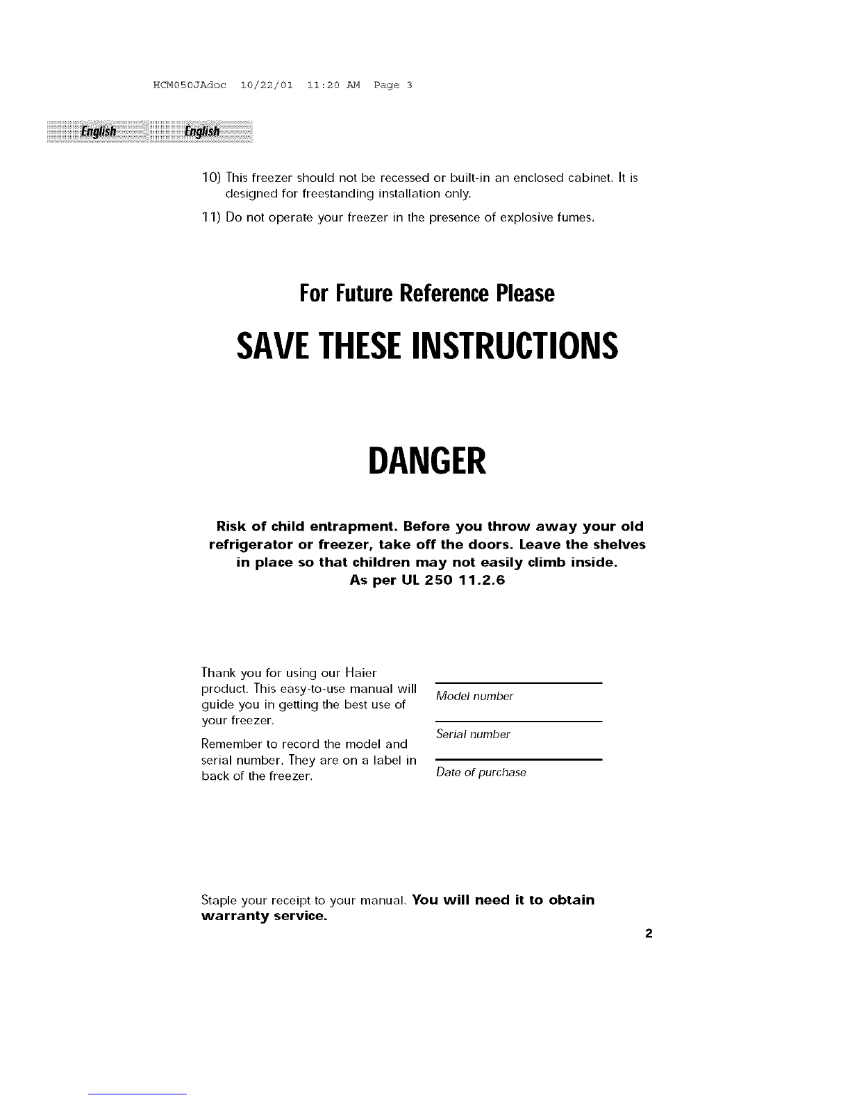 2) This freezer must be properly installed in accordance with the