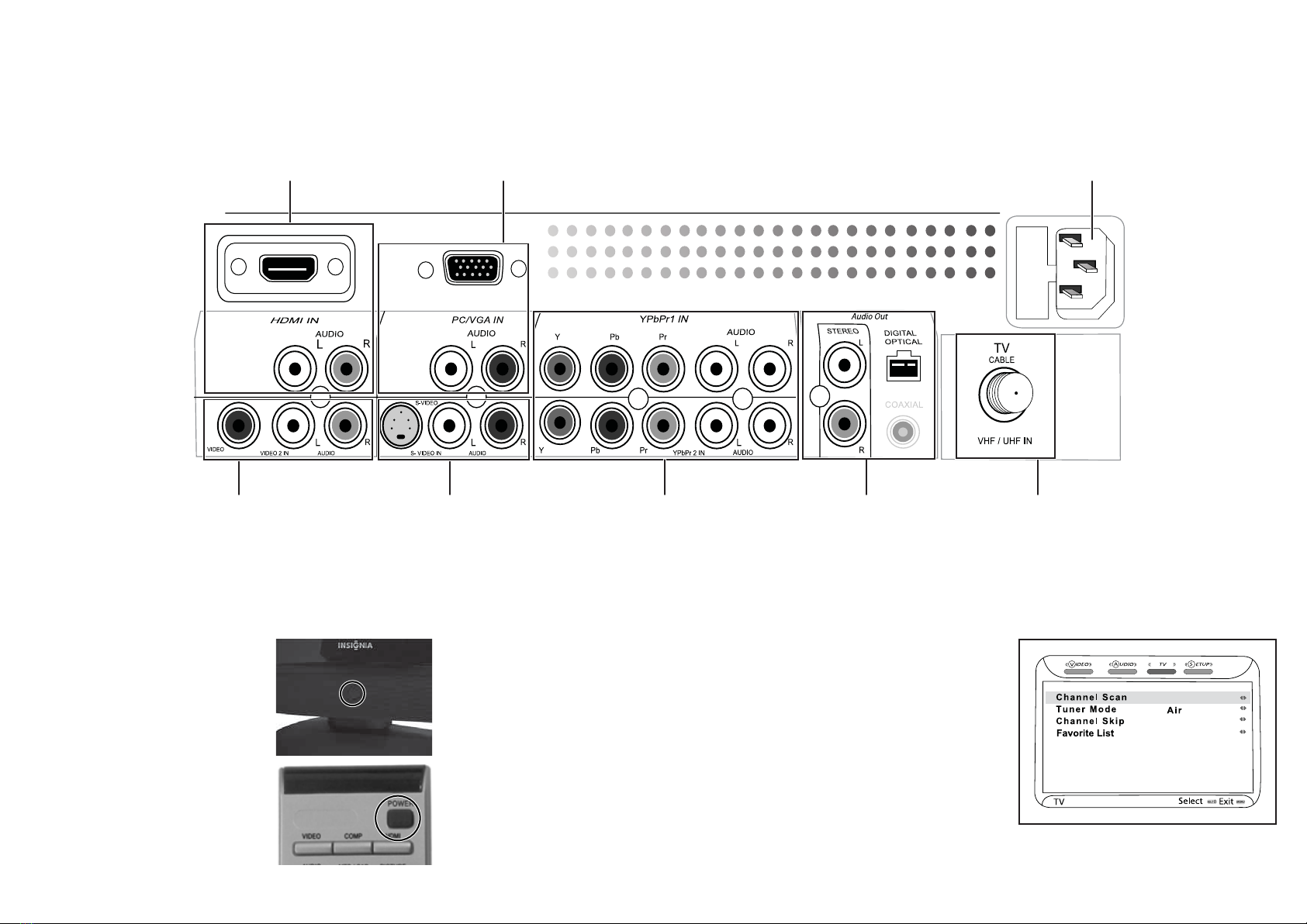 on the TV and to a wall outlet. Press the power
