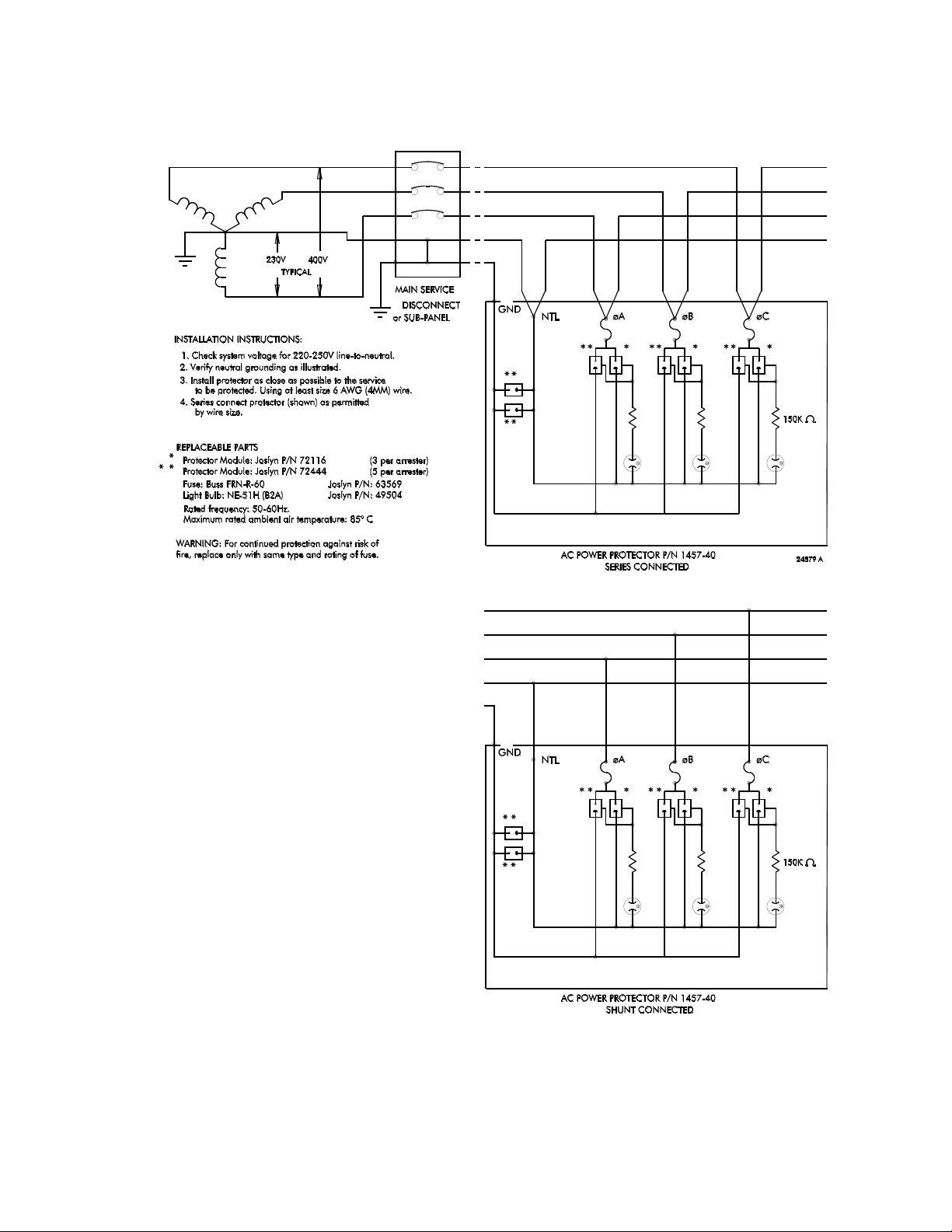 The Joslyn AC Surge Protector P/N 1457-40 is intended for installation on power systems of
