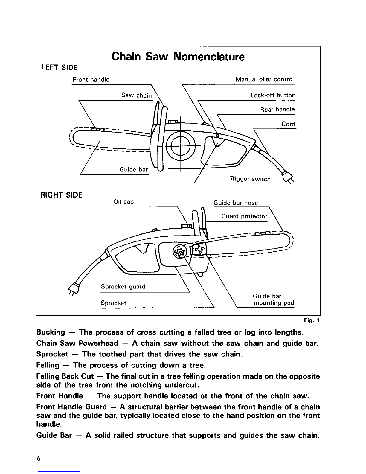 the switch, the guide bar and saw chain to the rear.