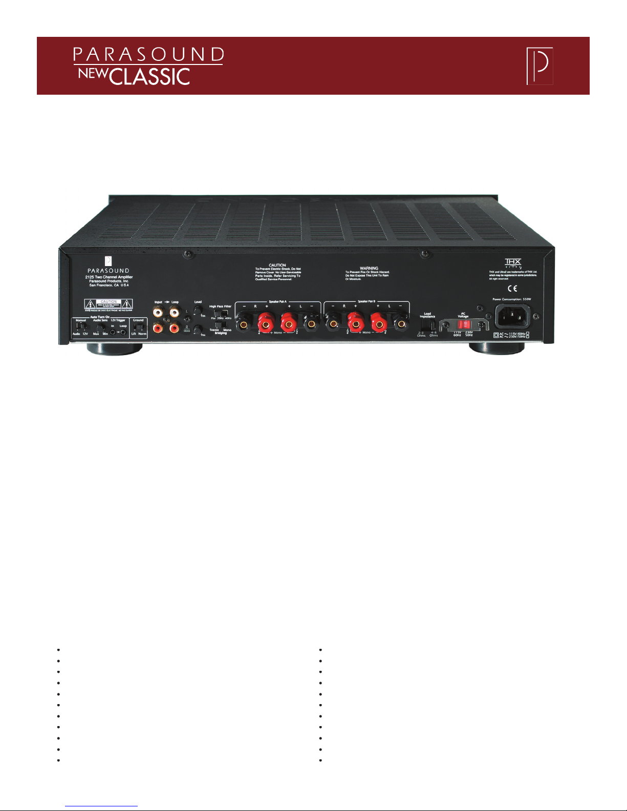 The Model 2125 is a Class AB amplifi er designed for effi cient, low heat operation.