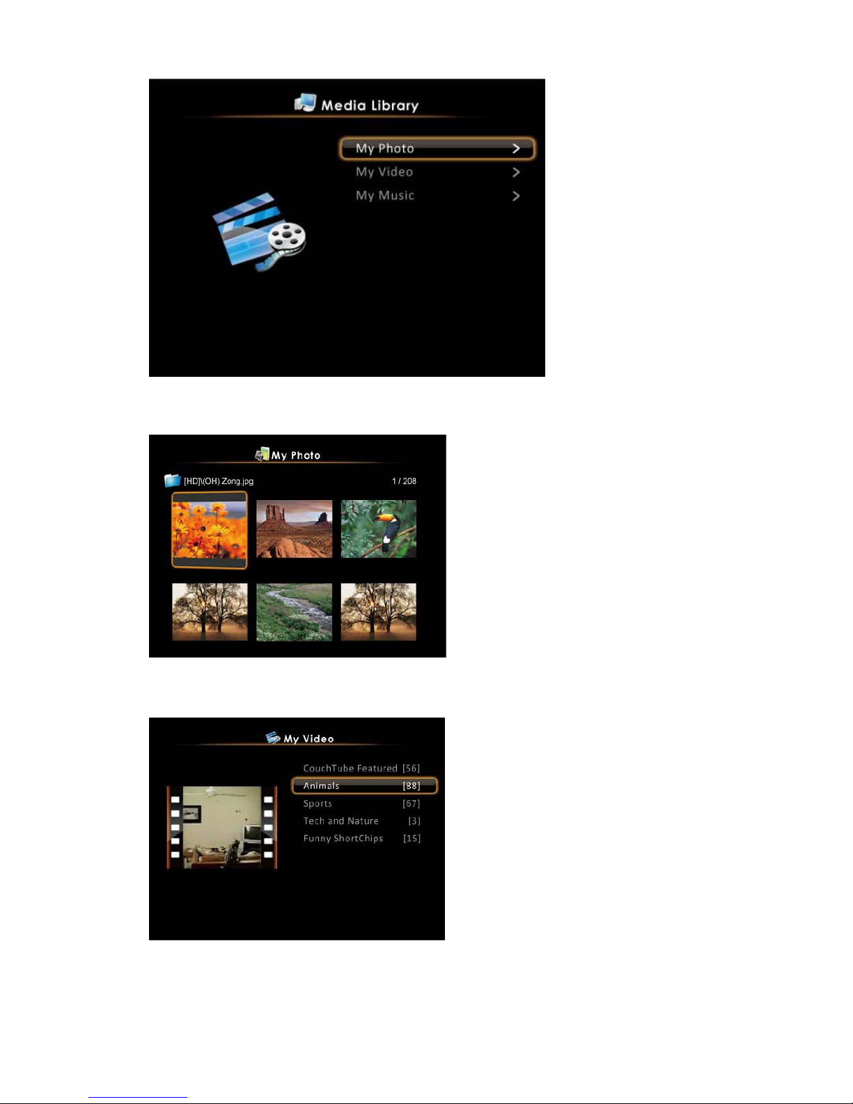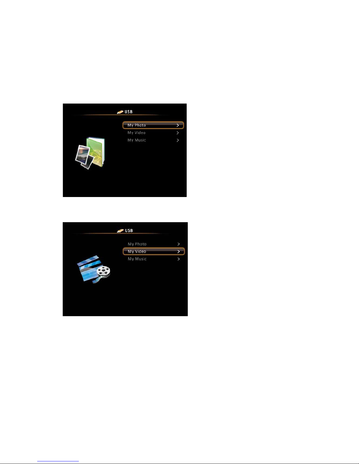 (photo/video/music), and use the remote control to browse the storage for files matching the