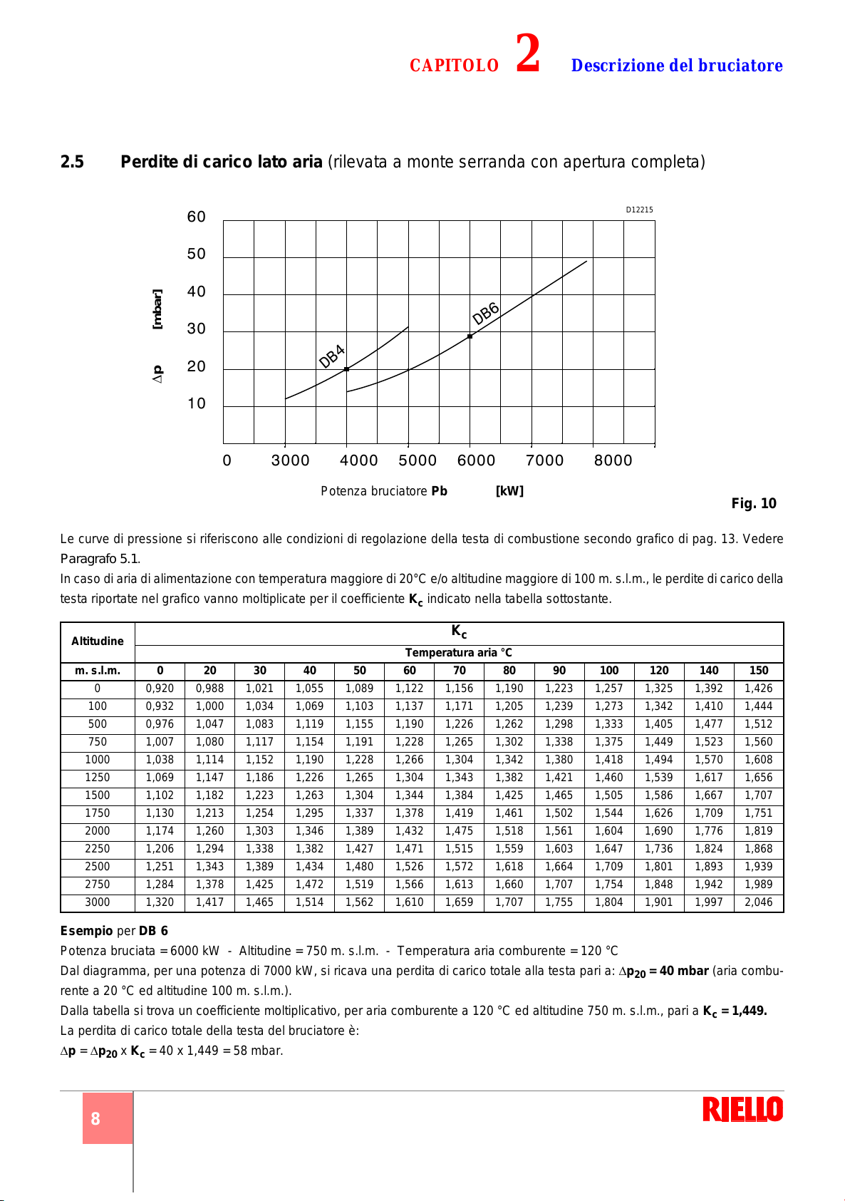 Le curve di pressione si riferiscono alle condizioni di regolazione della testa di combustione secondo grafico di pag. 13. Vedere