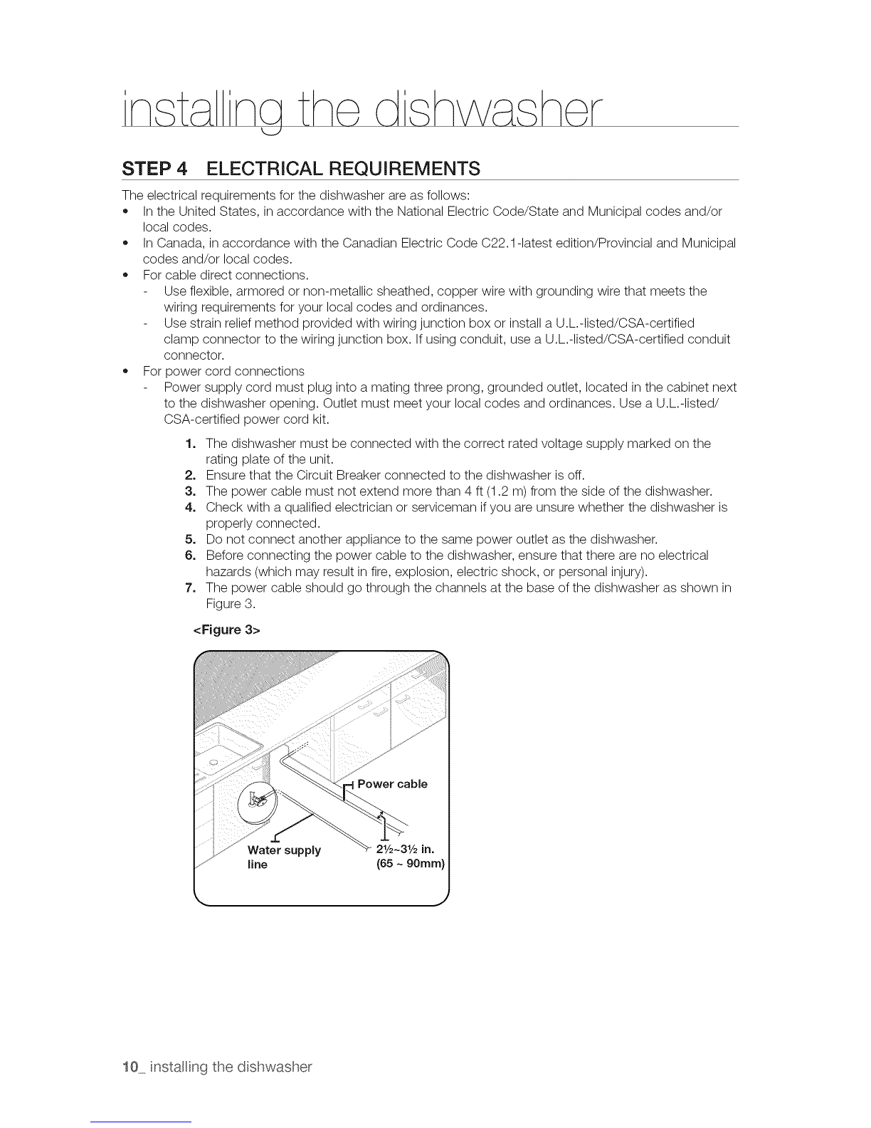 installation. Connecting the power cable is the last step when installing the dishwasher.