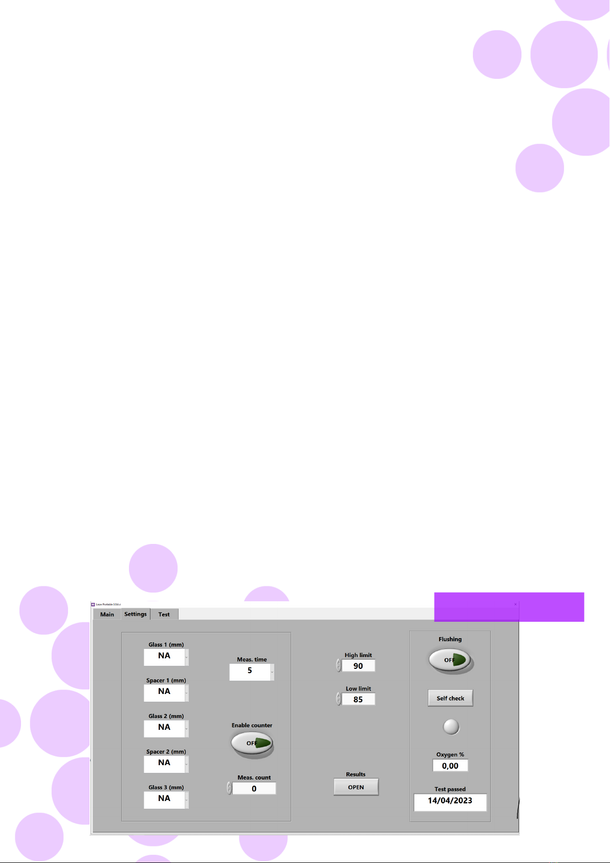 “Flushing”, “Self check”, “Oxygen %”, and “Test