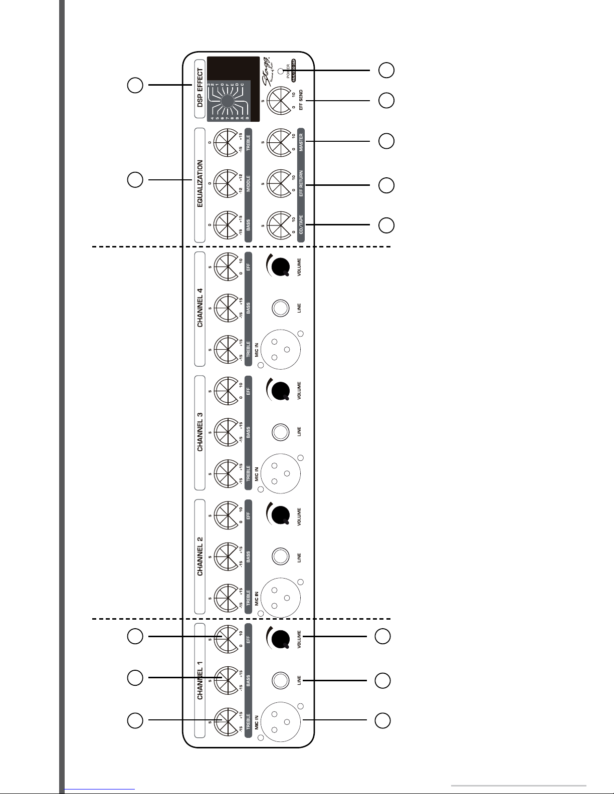 4) MASTER: This is the master volume which controls the overall volume level of the unit.