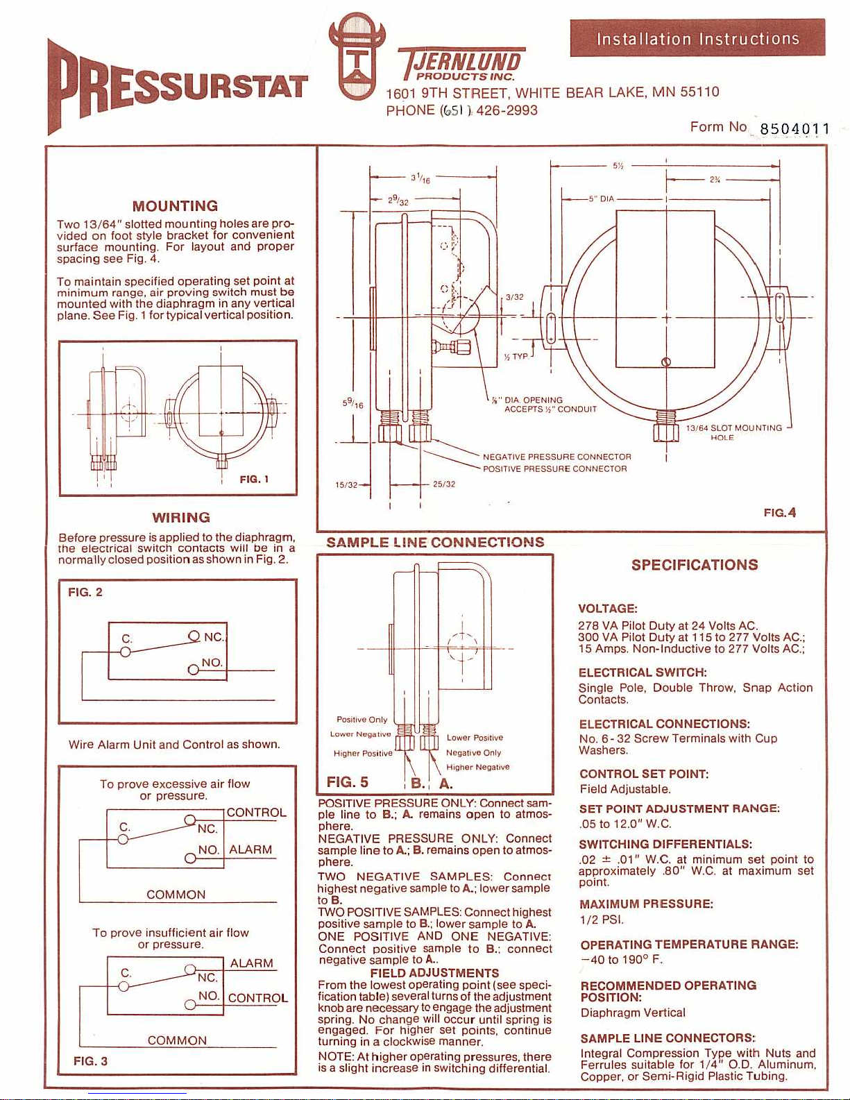 TJERNLUND 950-2080 NEW STYLE GAS PRESSURE SWITCH Manuale utente