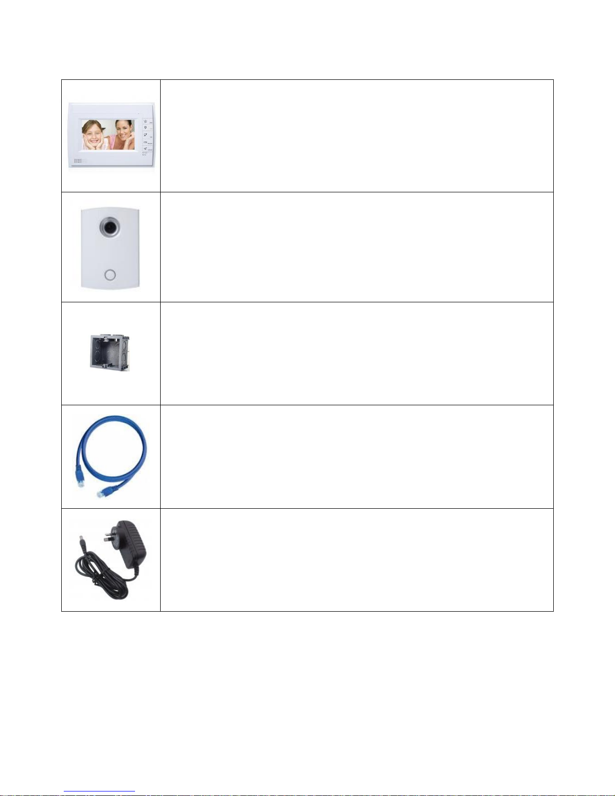 You will also require a Cat5e network cable from each the Indoor Monitor and Door Station, to a network