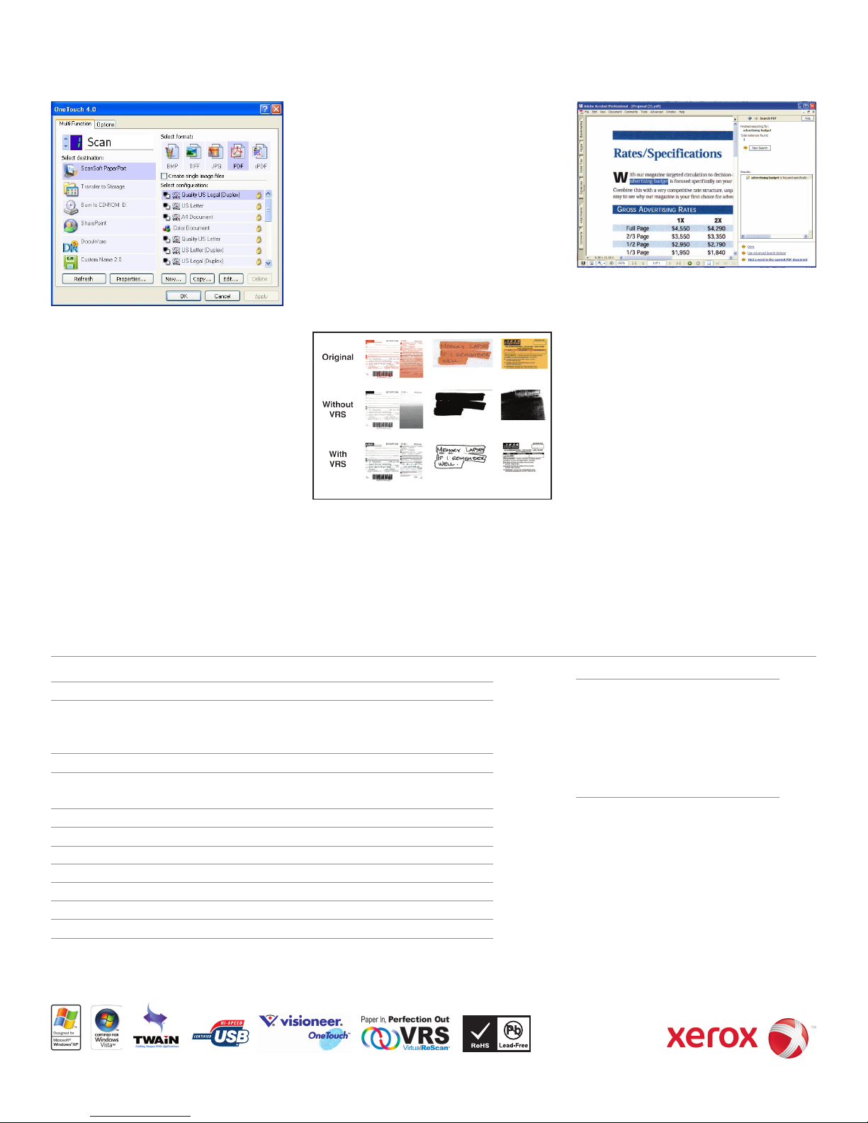 ©2008 Xerox® and DocuMate® are trademarks of Xerox Corporation in the United States and/or other countries. Visioneer OneTouch is a registered trademark of Visioneer, Inc. Kofax, and VirtualReScan (VRS), are trademarks of Kofax Image Products, Inc.